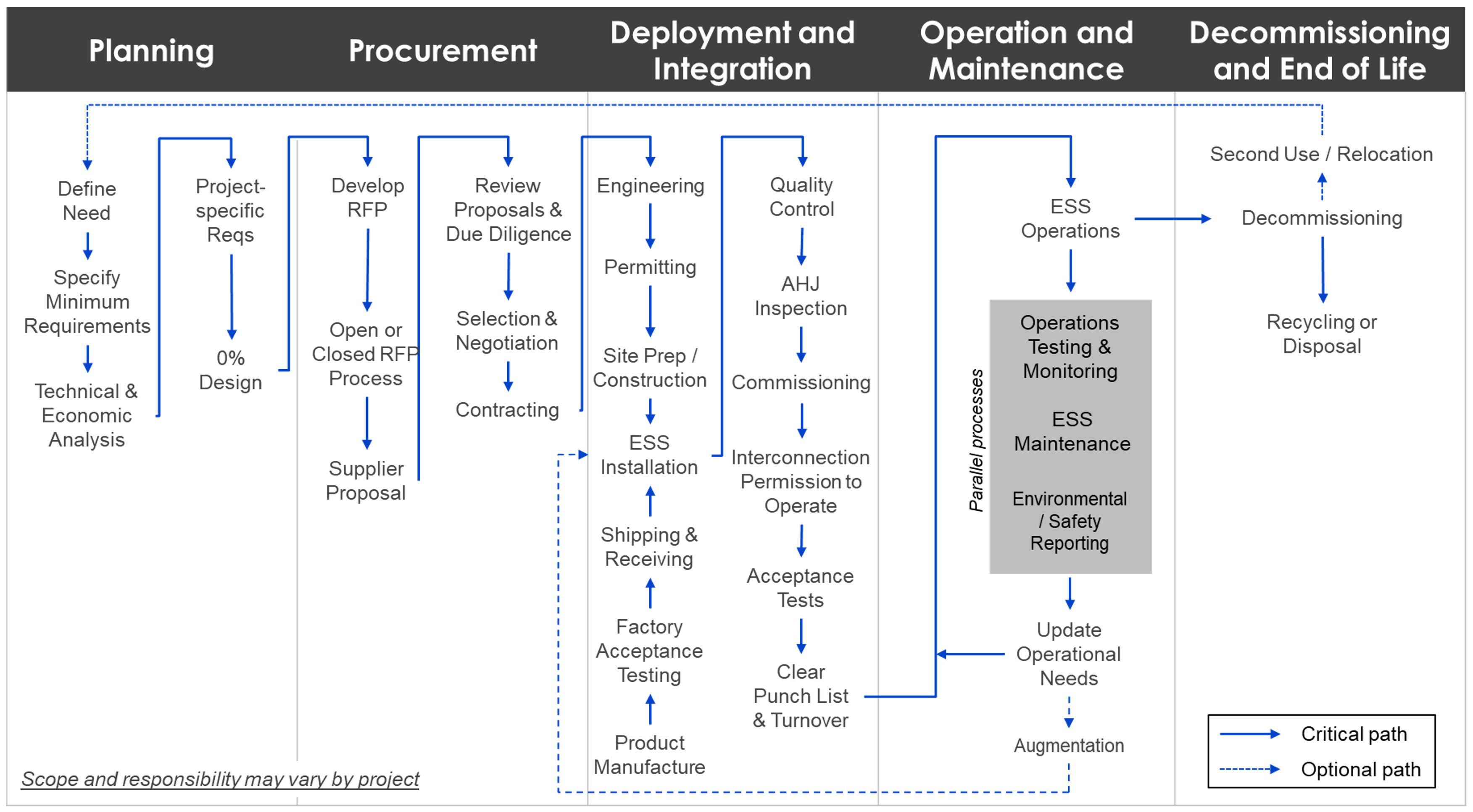 The life cycle of an energy storage project has been divided into five phases (see Figure 1-1). The phases used to organize the life cycle of a project are: