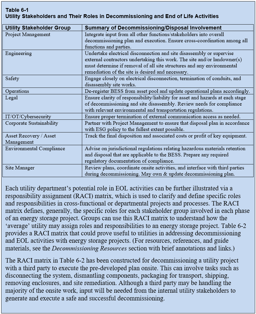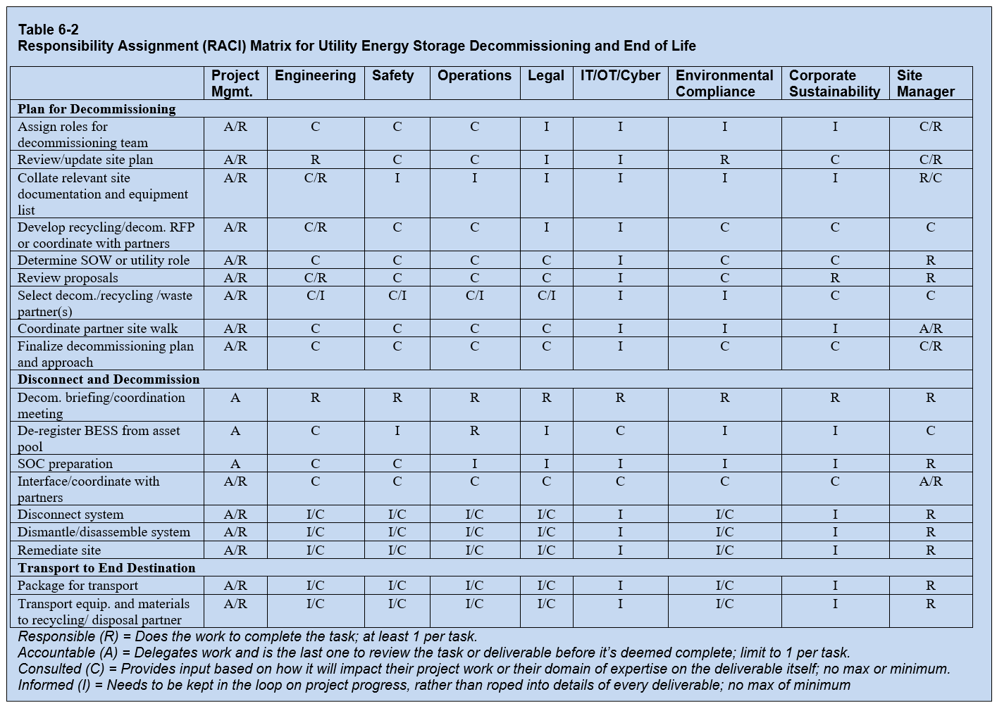 Decommissioning can be a time-consuming process. Because large, utility-scale BESS are a relatively new product and asset class, many processes and regulations have yet to be standardized. In addition, a wide range of stakeholders are involved in the process – both internally (including the various functions detailed in Table 6-1 and Table 6-2) and externally (such as regulatory authorities or recycling partners). In addition, a variety of BESS sizes, designs, and ancillary equipment exist, meaning that while the overall dismantling and salvage steps from different types of BESS remain the same, the labor effort and cost for disassembly, details of packaging and logistics, ability to bring cranes and large trucks on site, quantity of materials to be removed and other details will vary substantially by site. Thus, the decommissioning process should be shaped to meet the needs of individual projects.